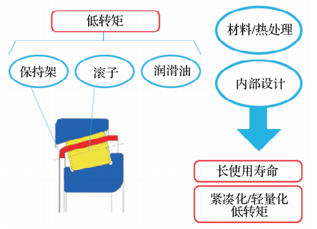 通过材料、热处理、内部设计参数的变化以及诸如密封、保持架、润滑脂的改进(图1),实现低转矩的要求和紧凑化、轻量化的设计。