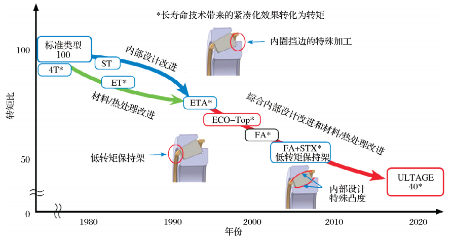 不同类型深沟球轴承的结构和性能特点见表1。通过比较转矩,自20世纪80 年代以来深沟球轴承的技术史如图2所示。