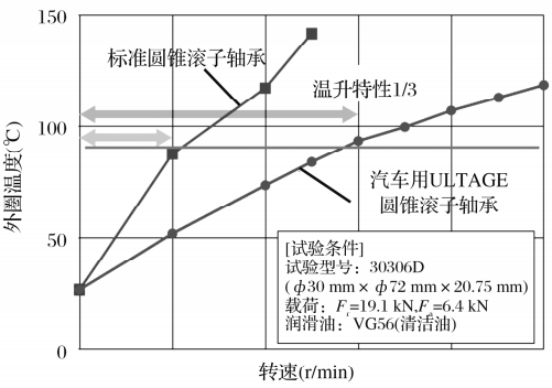 在温升试验中,其温升为标准轴承的1/3,证实了其优越的卡死抗力,如图10所示。如图7所示,优化了挡边和滚子端面形状,得到了优越的卡死抗力。